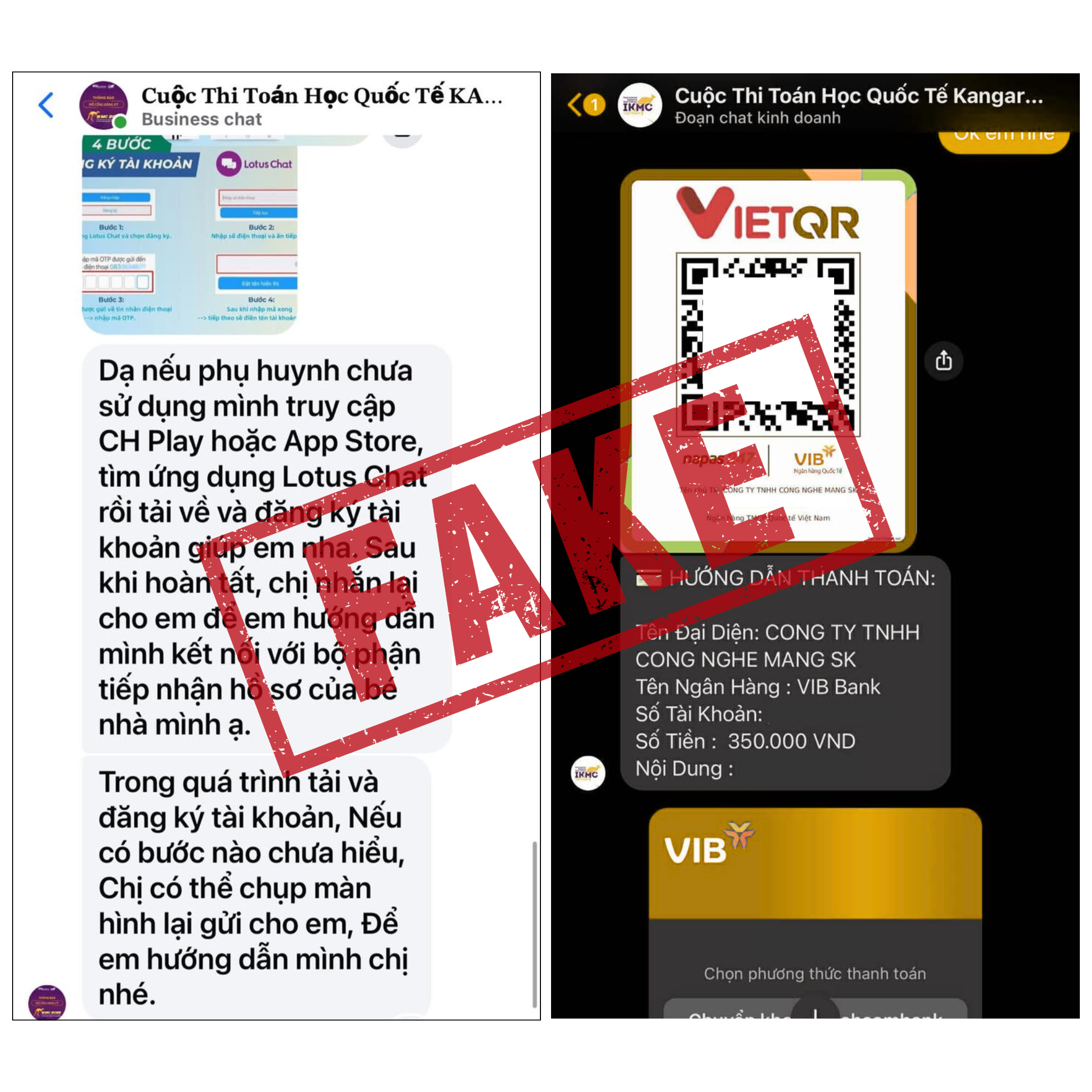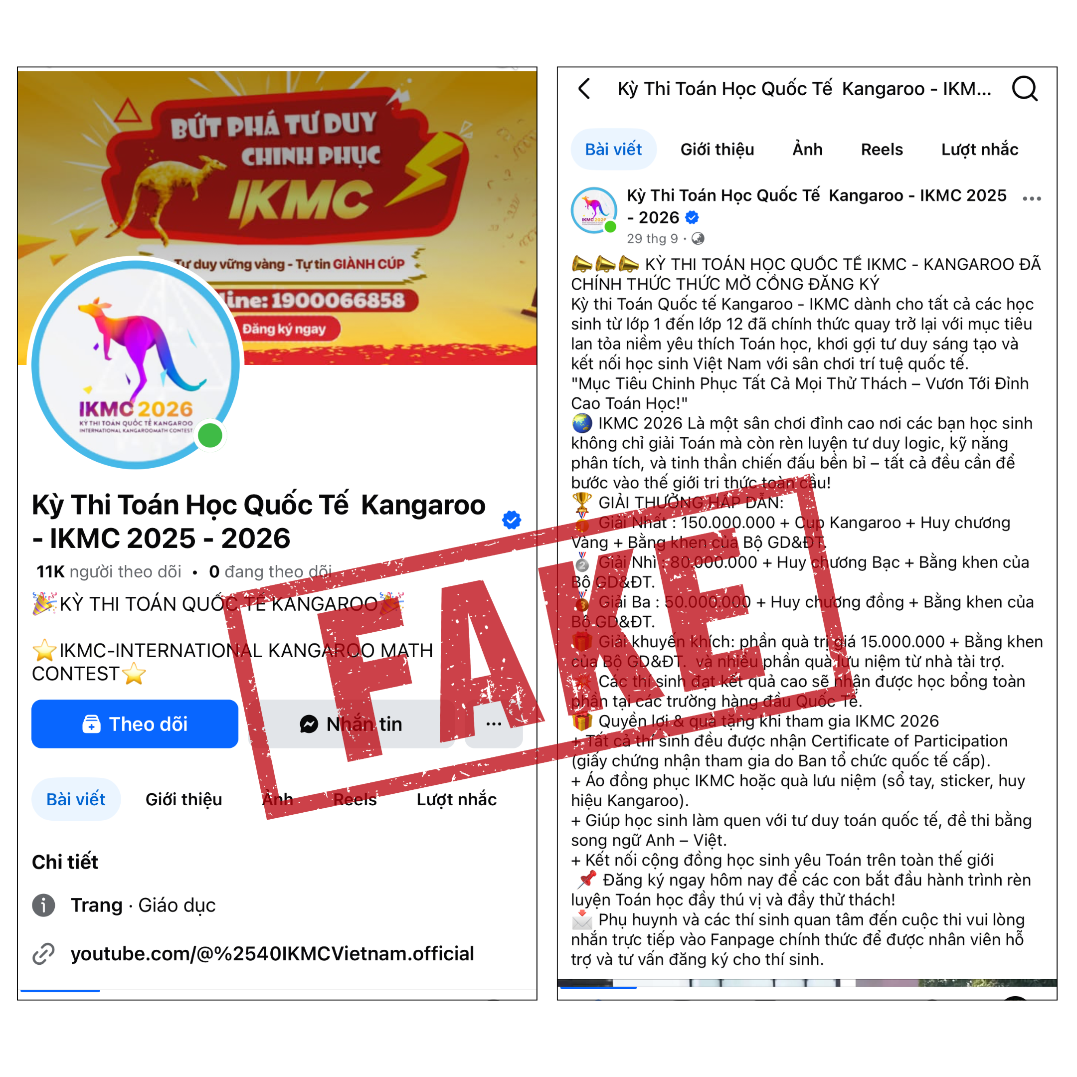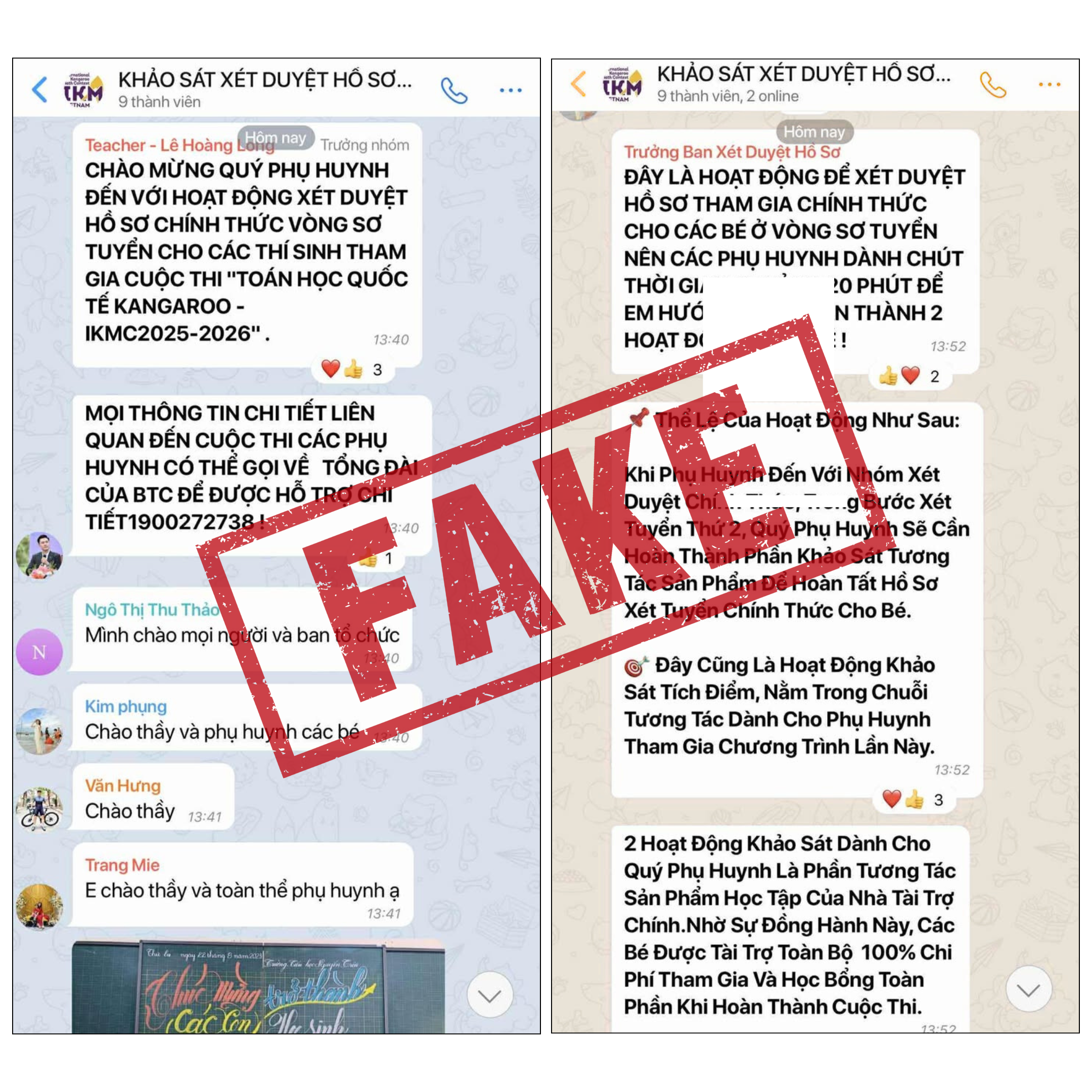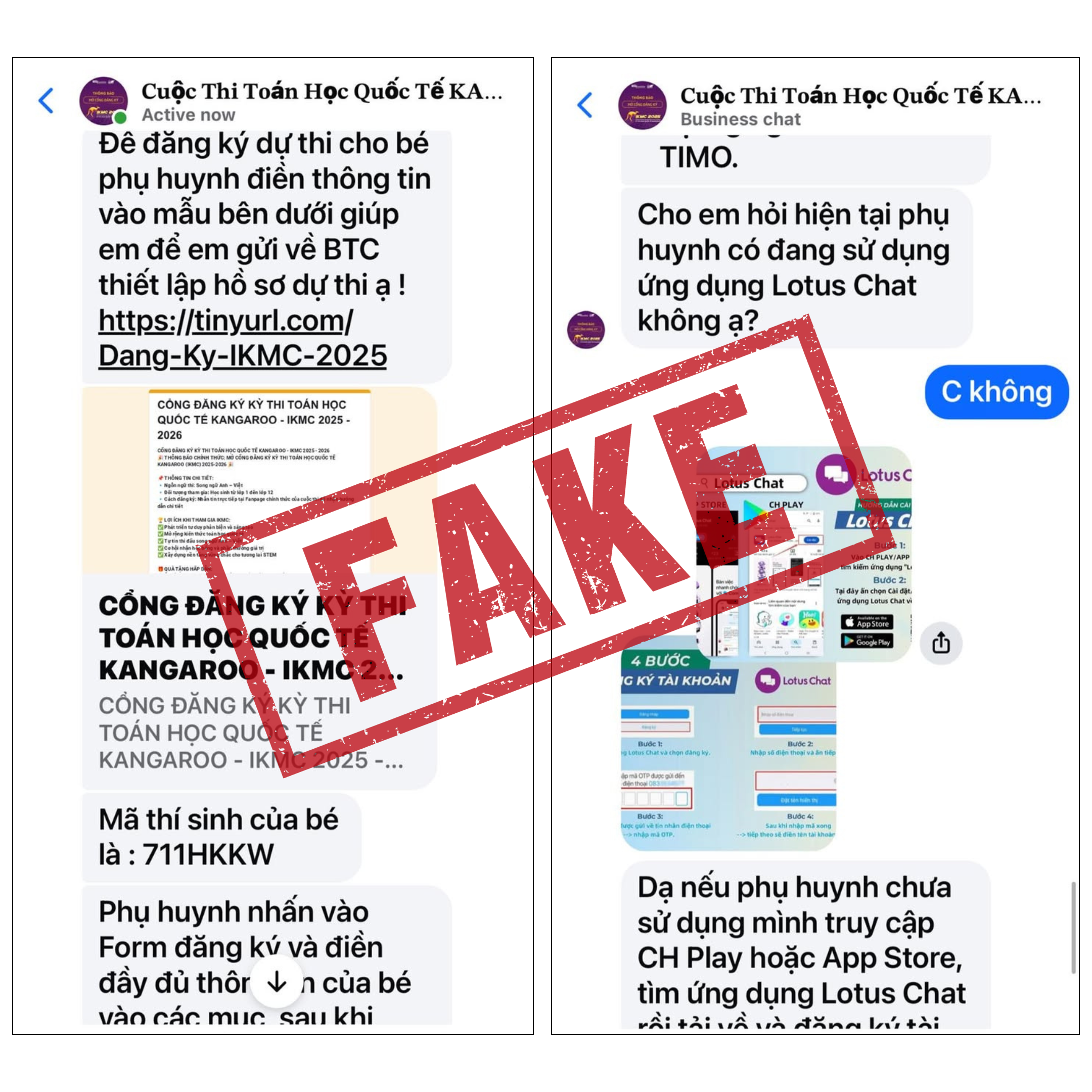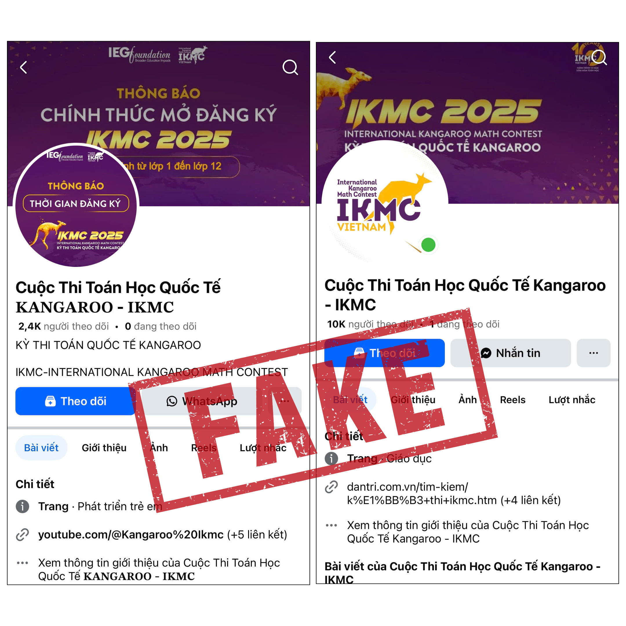BTC đã ghi nhận rất nhiều các Fanpage, tài khoản giả mạo, cố tình mạo danh Kỳ thi Toán Quốc tế Kangaroo - IKMC để lừa đảo và yêu cầu phụ huynh thực hiện các nhiệm vụ khác nhau trên ứng dụng Zalo, Telegram, Lotus,...và cuối cùng thực hiện chuyển khoản lên đến hàng chục, hàng trăm triệu đồng.